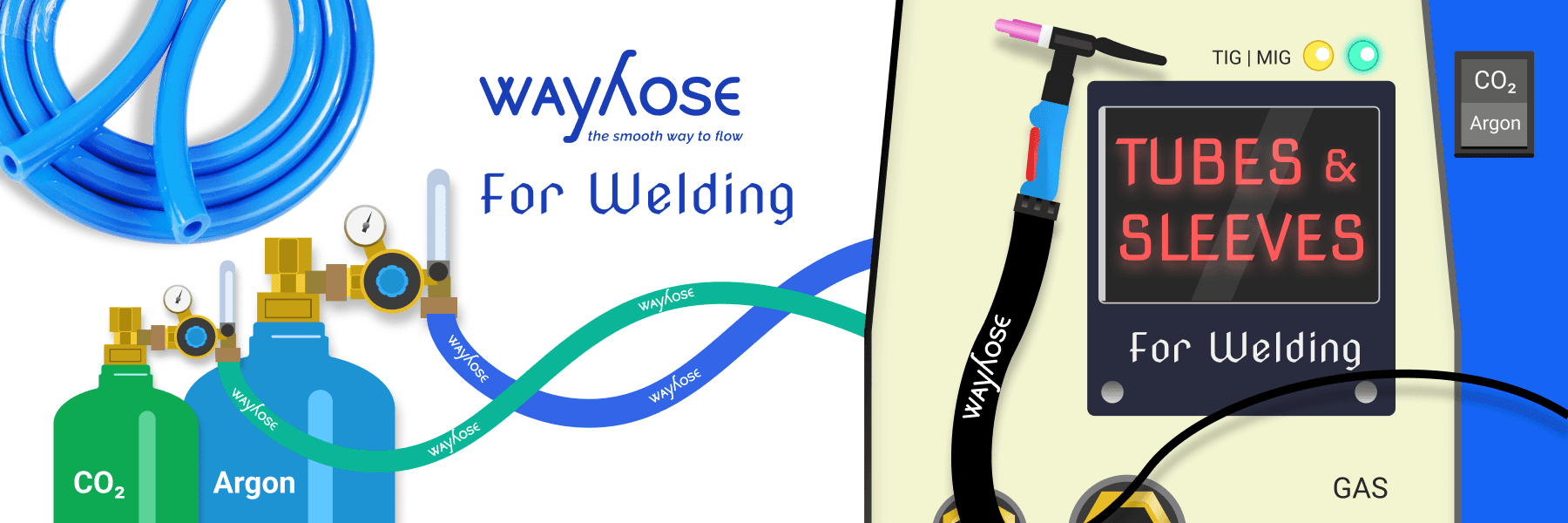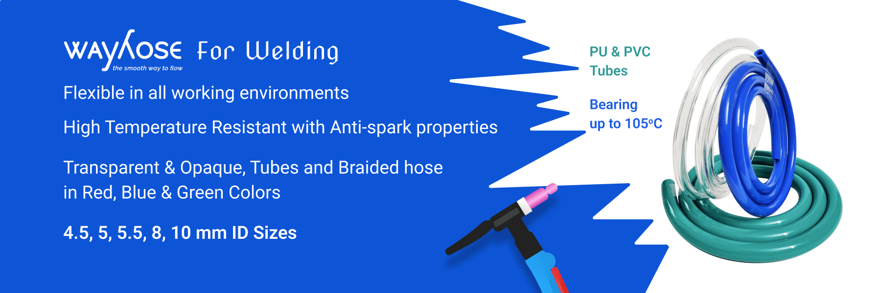 Argon Gas Welding Torch, Mig Welding Torch, Tig Welding Torch uses various flexible tubes. These tubes need to be high temp resistant and highly flexible for the flow of any gaseous fluid or to act as a cover for any other cable operation. Wayhose tubes for different welding torches are made to suit the process condition like temp, pressure etc. Numerous combinations of Inner x Outer diameters with or without yarn reinforcement are made as per the specifications in demand. Some of the generally used tubes and hoses for welding torches are listed below. These are made of High Temp PVC or Polyurethene