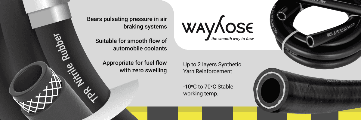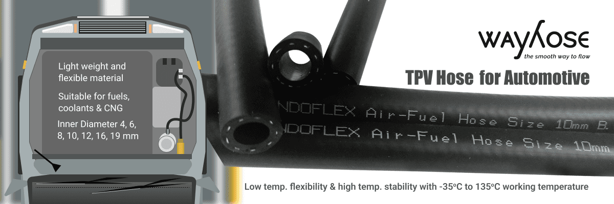Thermoplastic vulcanizates are rubber blends which have great flexibility at even −40°C and shows good dimensional stability at high temperature of 140°C, one of the best class of TPV is Santoprene. Wayhose under this class is made of Santoprene reinforced with polyester yarn. EPDM rubber is the base of these compounds. Multiple uses like CNG kits, coolant, urea, etc. In automotive.