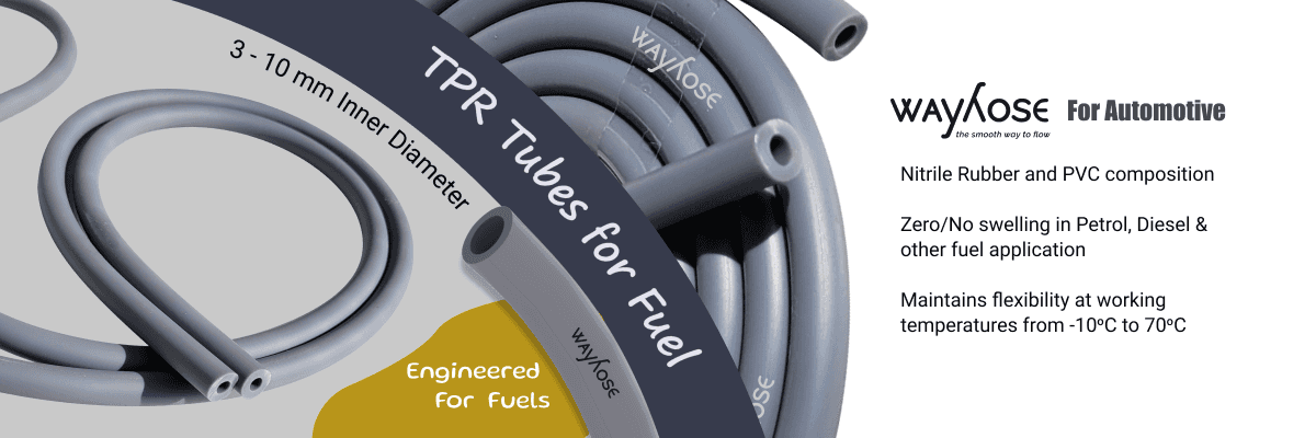 Hoses made from thermoplastic rubbers with rubber part of NBR and thermoplastic part of soft PVC reinforced with polyester Yarn. Exhibiting lowest swelling in fuel applications and good dimensional stability even at high temperature of 90°C, these multipurpose hoses are suitable for automotive uses such as